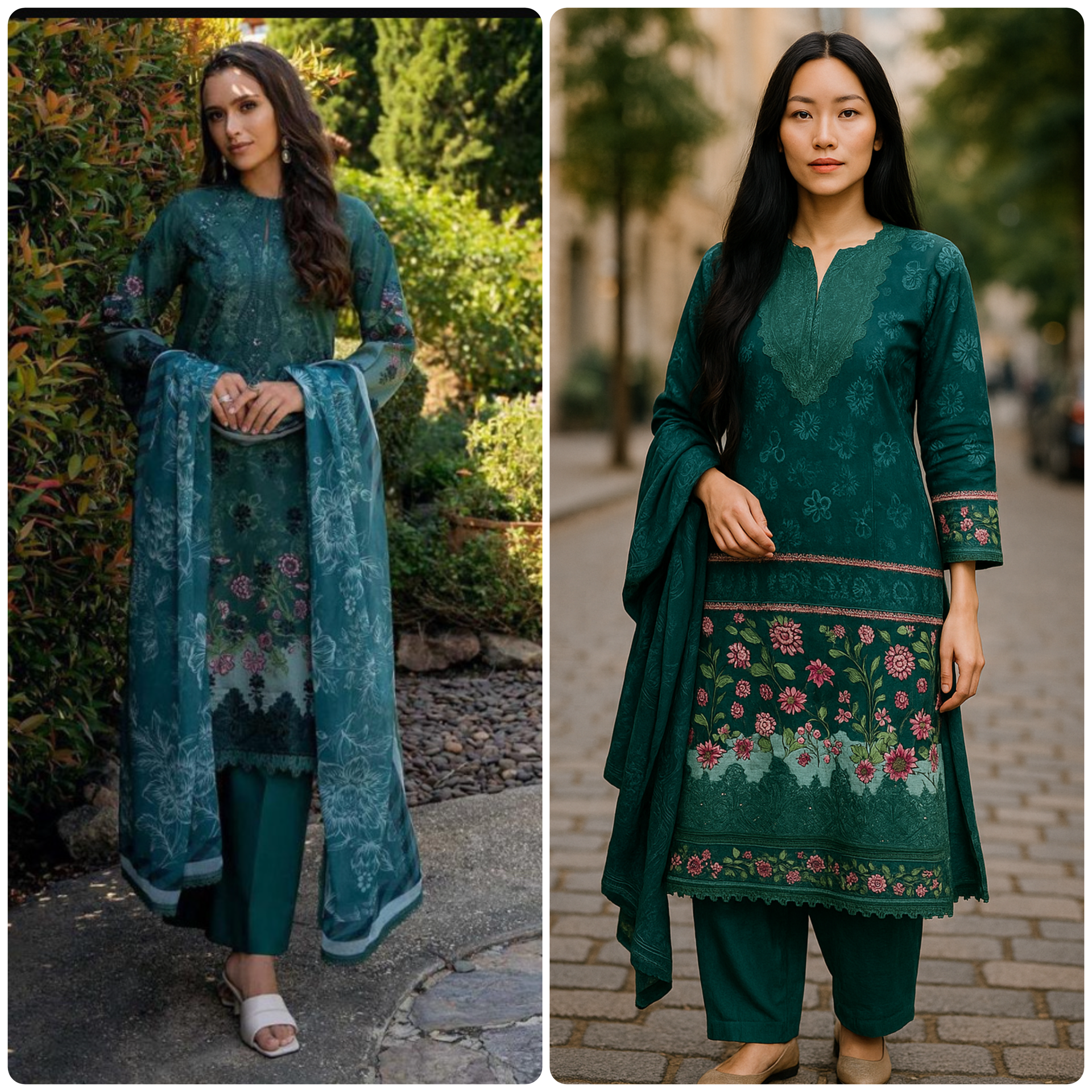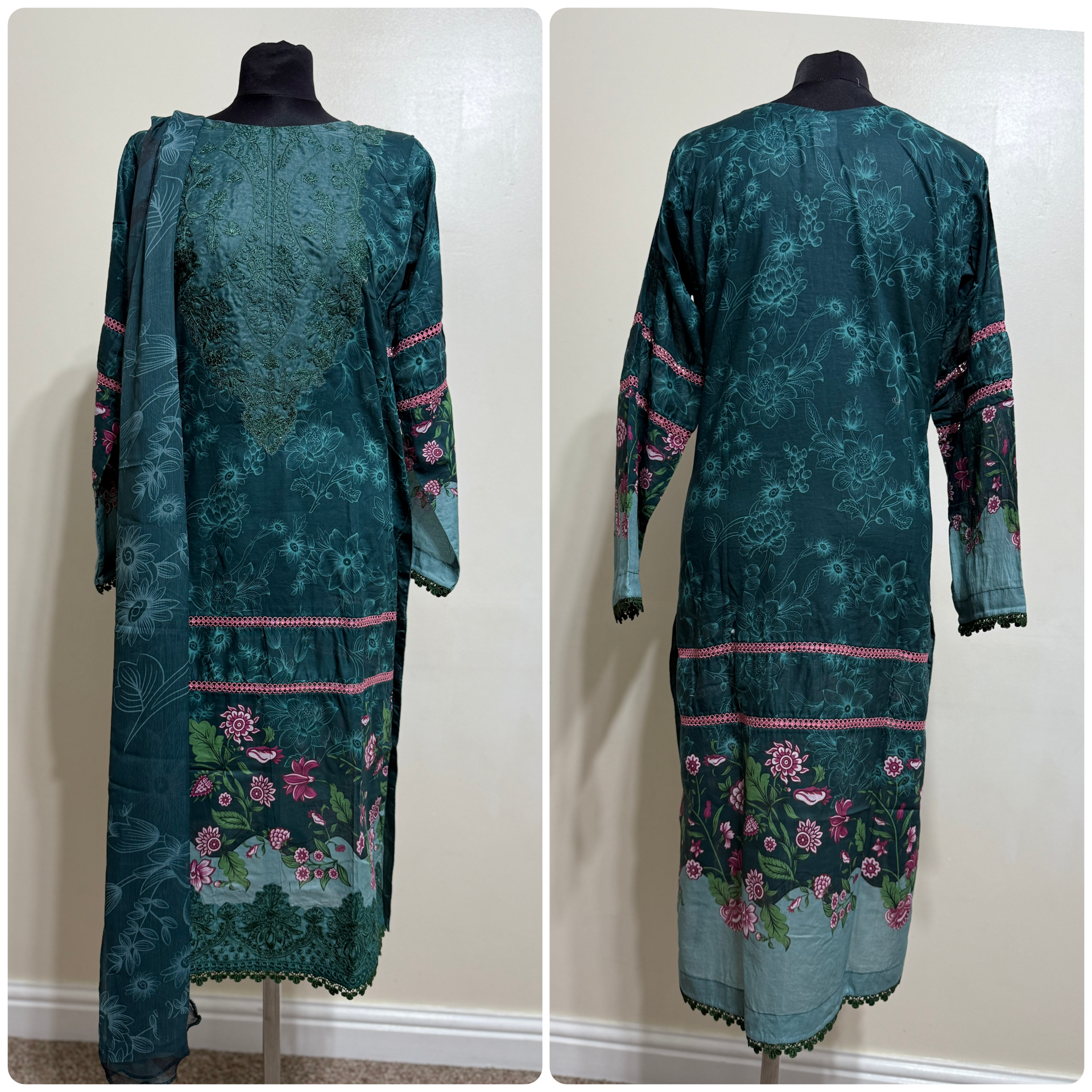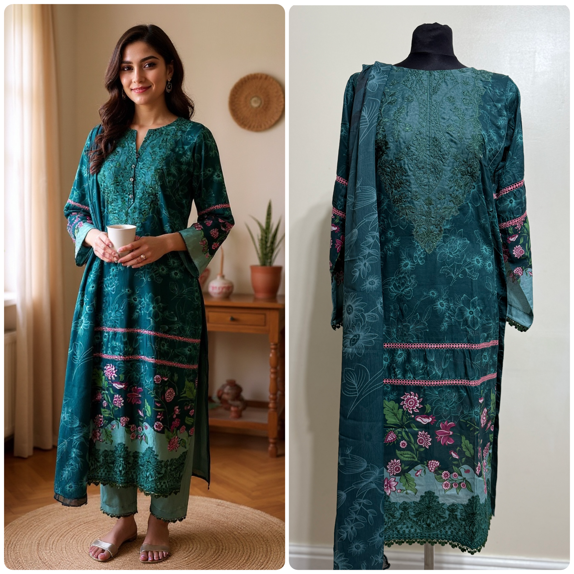 The set includes a beautifully designed kameez, matching salwar, and a flowing chiffon dupatta that adds a touch of sophistication. Perfect for both casual and festive occasions, this ensemble combines traditional Pakistani fashion with modern elegance.