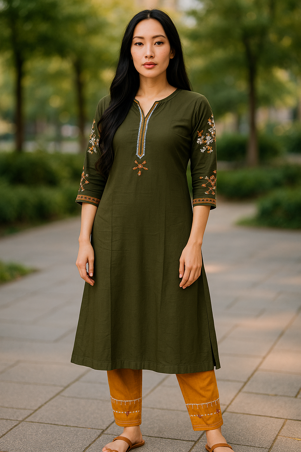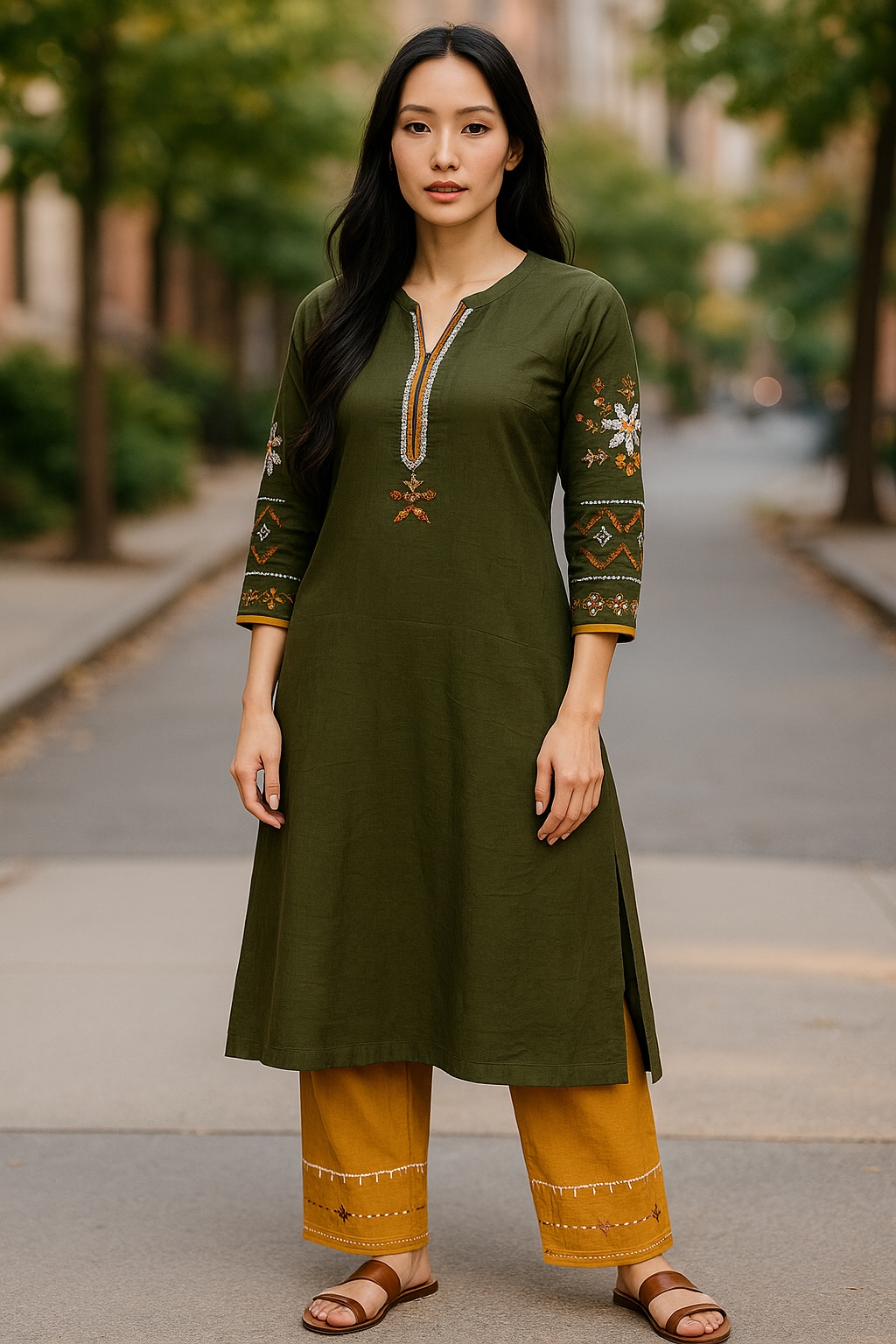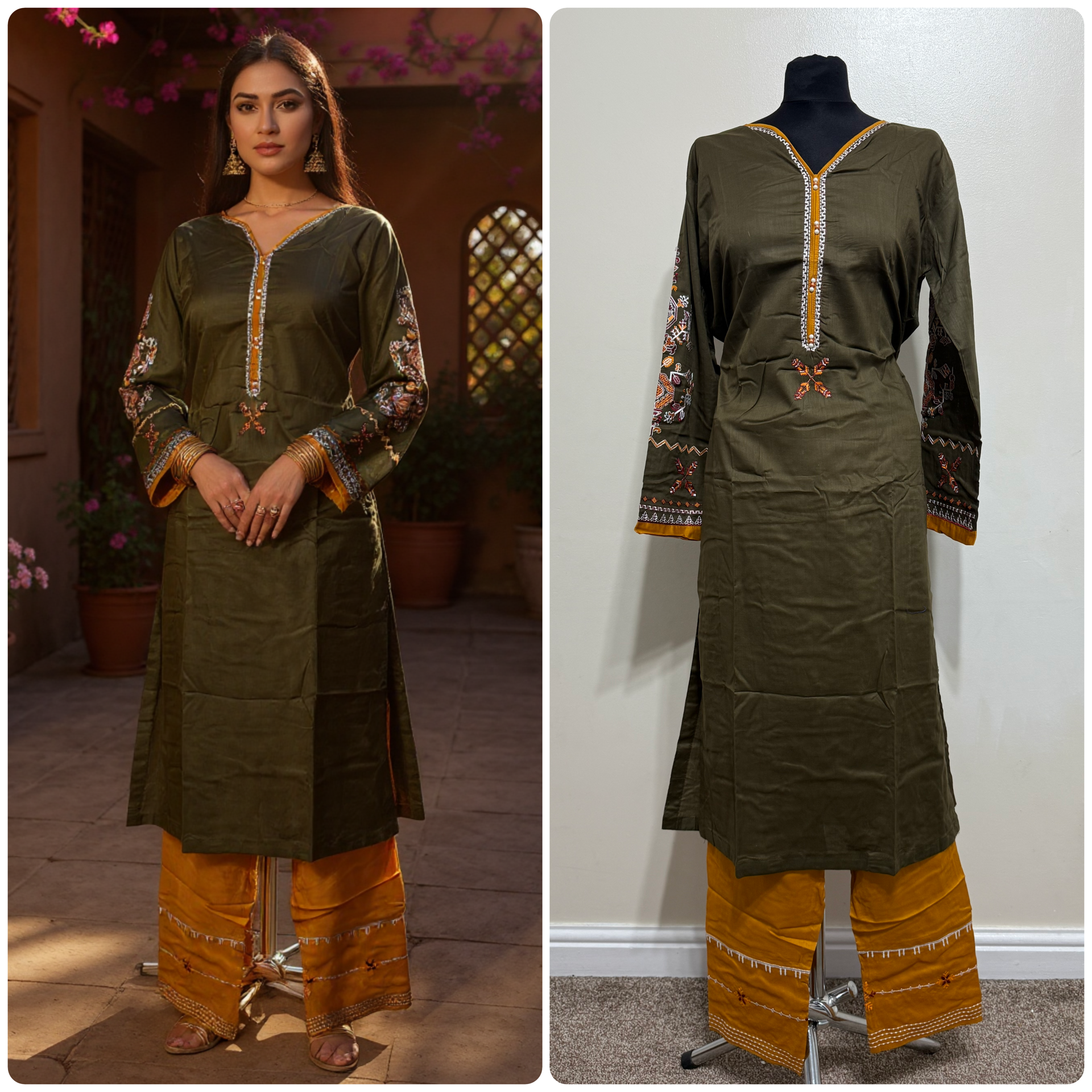 Designer Inspired by Iznik - 2 Piece Outfit Salwar Kameez Pakistan Fashion (Green Mustard)