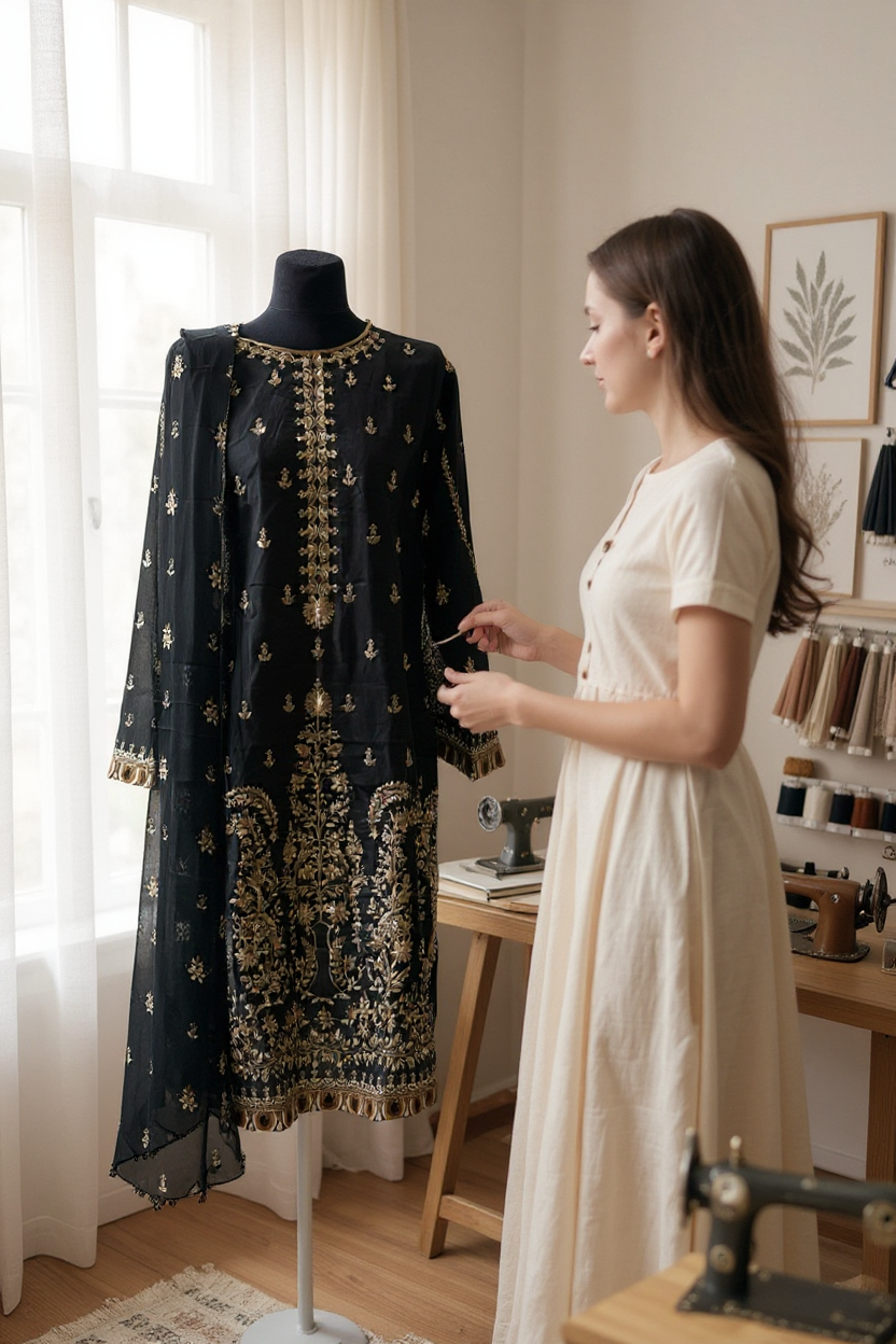 Designer Inspired by Maria B - 3 Piece Outfit Salwar Kameez Pakistan Fashion (Black)