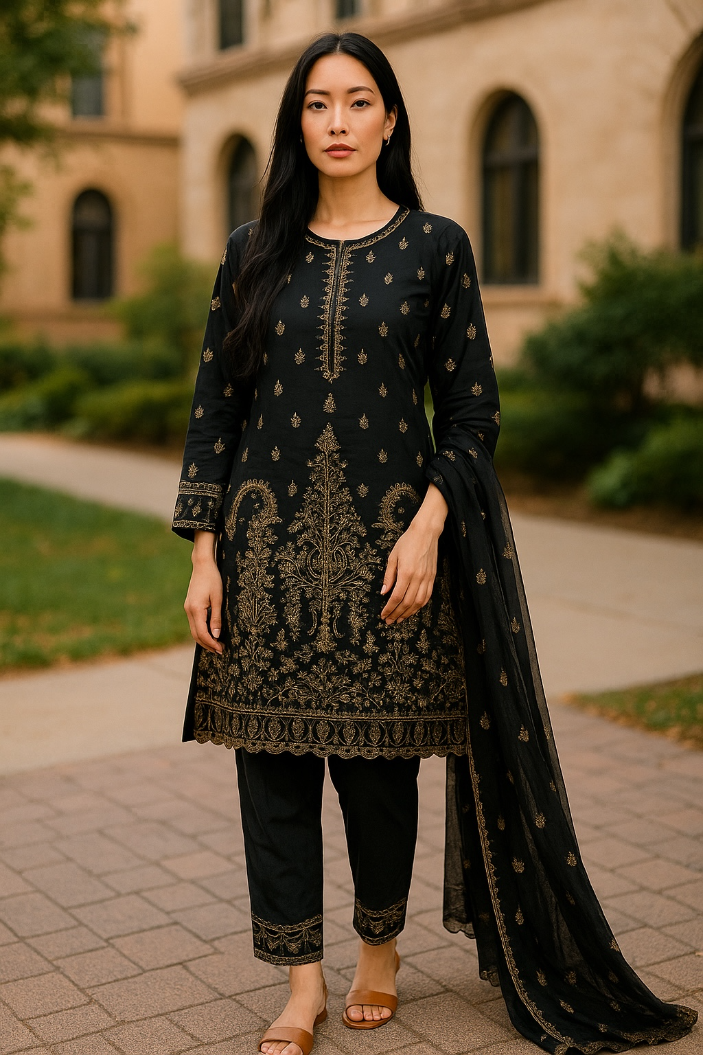 The set includes a beautifully designed kameez, matching salwar, and a flowing chiffon dupatta that adds a touch of sophistication. Perfect for both casual and festive occasions, this ensemble combines traditional Pakistani fashion with modern elegance.