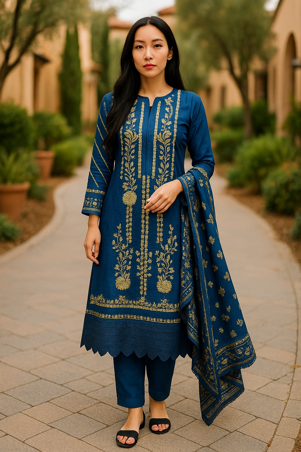 The set includes a beautifully designed kameez, matching salwar, and a flowing chiffon dupatta that adds a touch of sophistication. Perfect for both casual and festive occasions, this ensemble combines traditional Pakistani fashion with modern elegance.