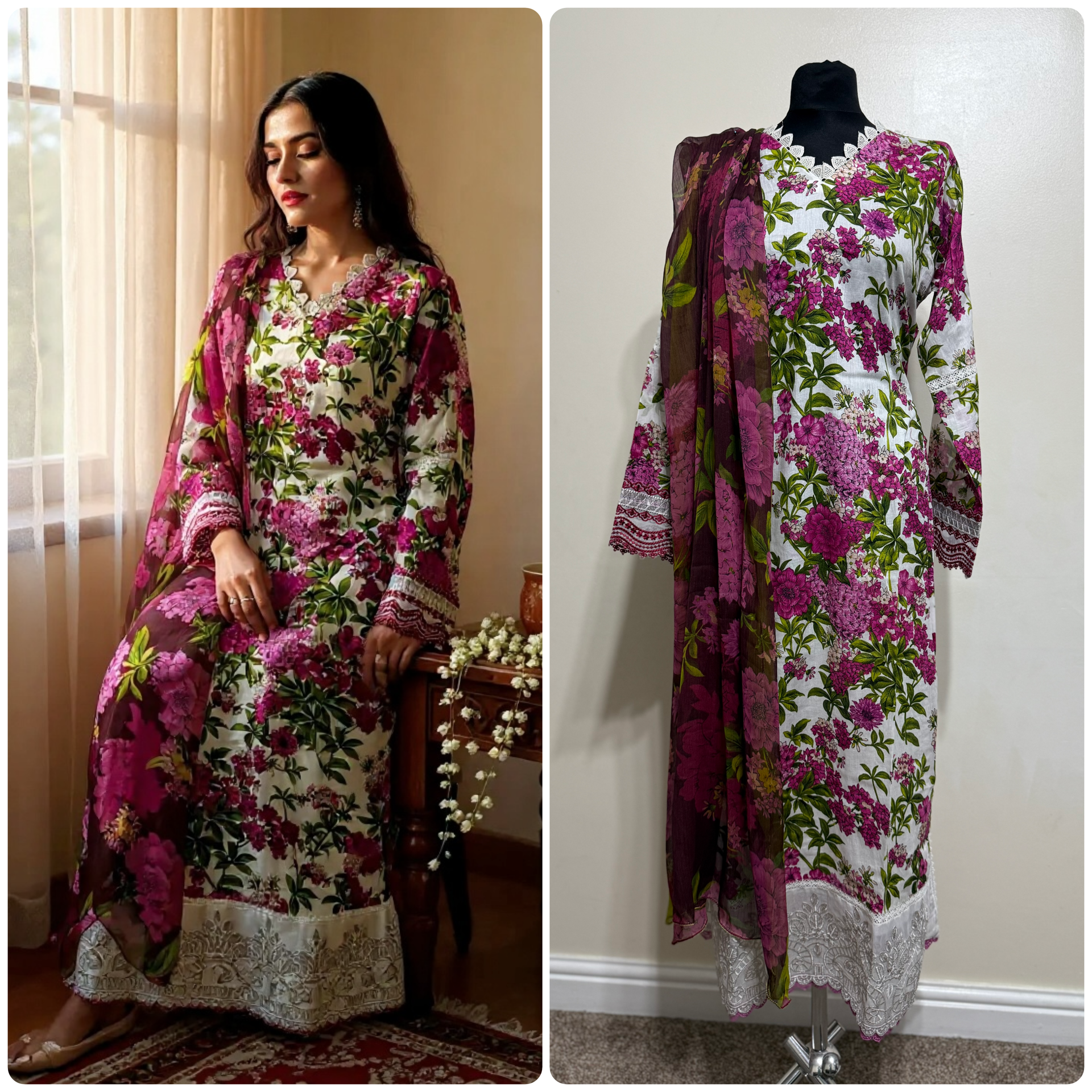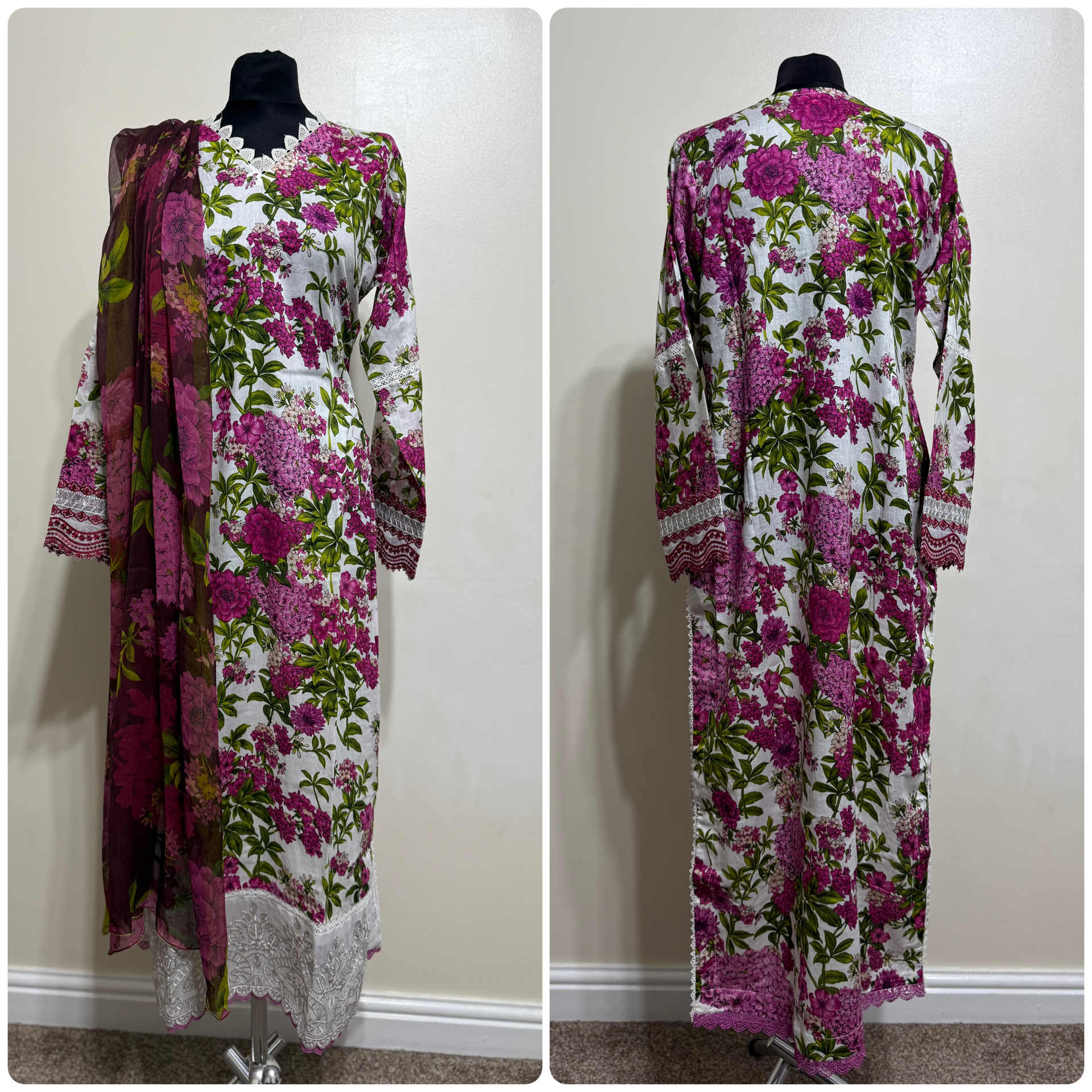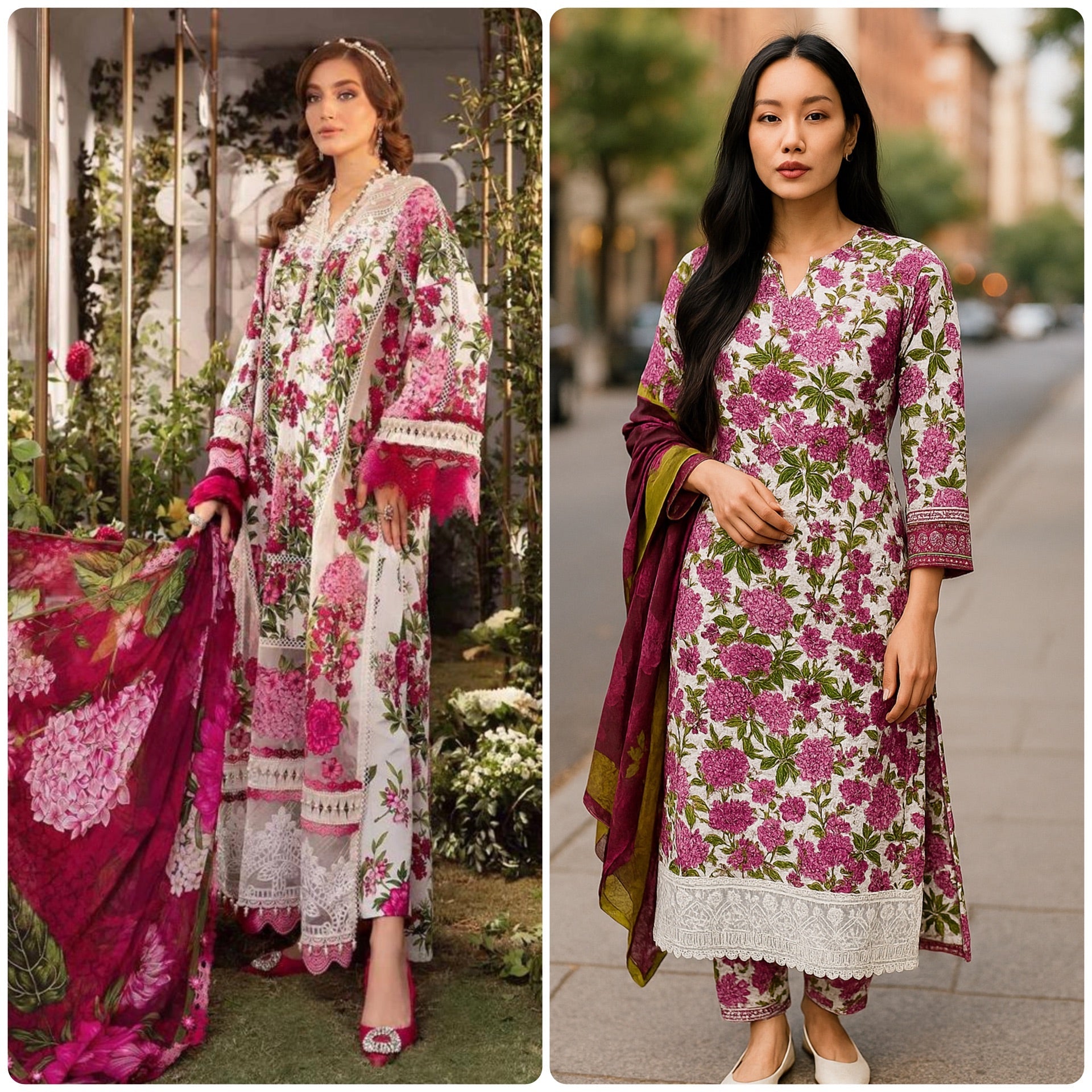 Embrace elegance with this stunning 3-piece Salwar Kameez inspired by Maria B. Featuring a vibrant pink floral design, it beautifully blends traditional Pakistani style with a modern flair, making it perfect for those who want to stand out with confidence. Available in sizes Small (38" chest) to X Large (44" chest), this outfit offers a flattering fit and a bold statement for any occasion. Elevate your wardrobe and turn heads wherever you go.