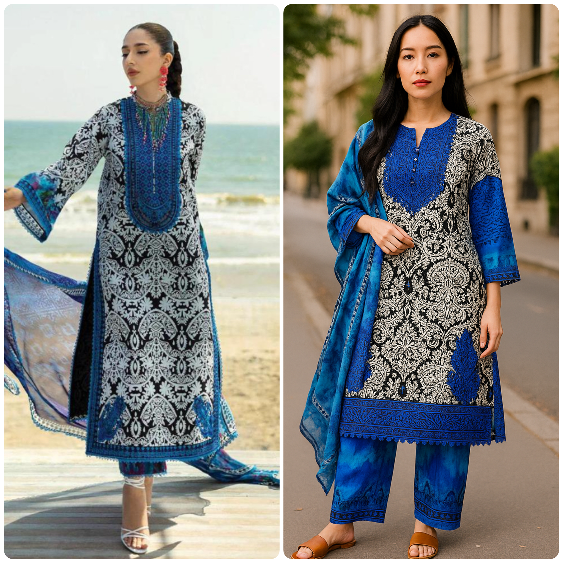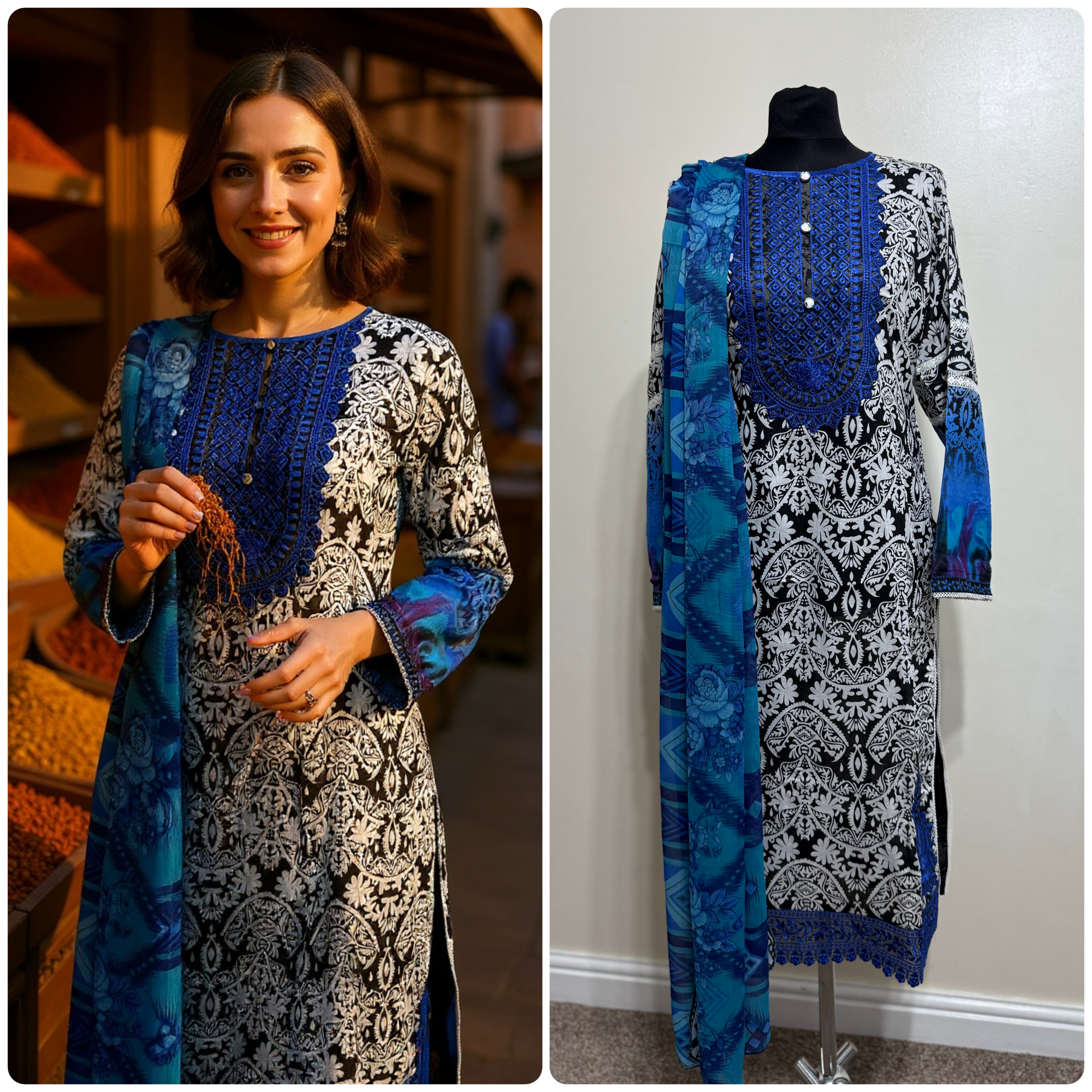 Make a bold statement with this daring 3-piece Salwar Kameez inspired by Zainab Chottani. Featuring a striking blend of blue and black, this outfit fuses traditional Pakistani elegance with a fearless, modern edge to set you apart from the crowd.